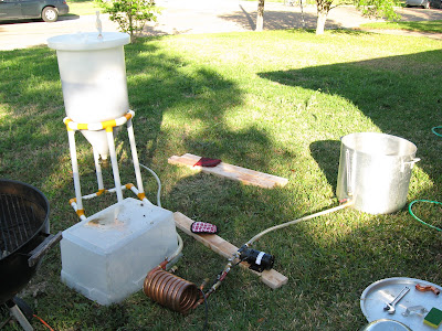 My brew-day went smoothly until the end. My kettle screen let some hop leaves by and they got clogged somewhere leaving me with half-chilled wort. What I should have done was stop the chill, disassemble my apparatus and back-flush the system into the kettle. What I did instead was to dump the hot wort into the fermenter to air cool. I had to walk the fine line between pitching yeast into scalding wort and giving infection too much time to take hold. I think I pitched too hot because it took about 24 hours to see activity from a decent starter. I would really like to get my system hard-plumbed and on a stand.